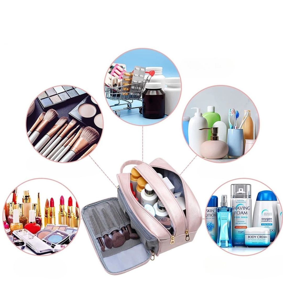 Kennst du das Gefühl, im Kosmetikchaos nach deinem Lieblingsprodukt zu suchen? Diese Tasche schafft Abhilfe Zwei großzügige Hauptfächer und zusätzliche Innenfächer sorgen für maximale Übersicht. Dank des wasserabweisenden Materials kannst du sie auch sorglos im Bad oder unterwegs nutzen – deine Produkte bleiben trocken und sicher.