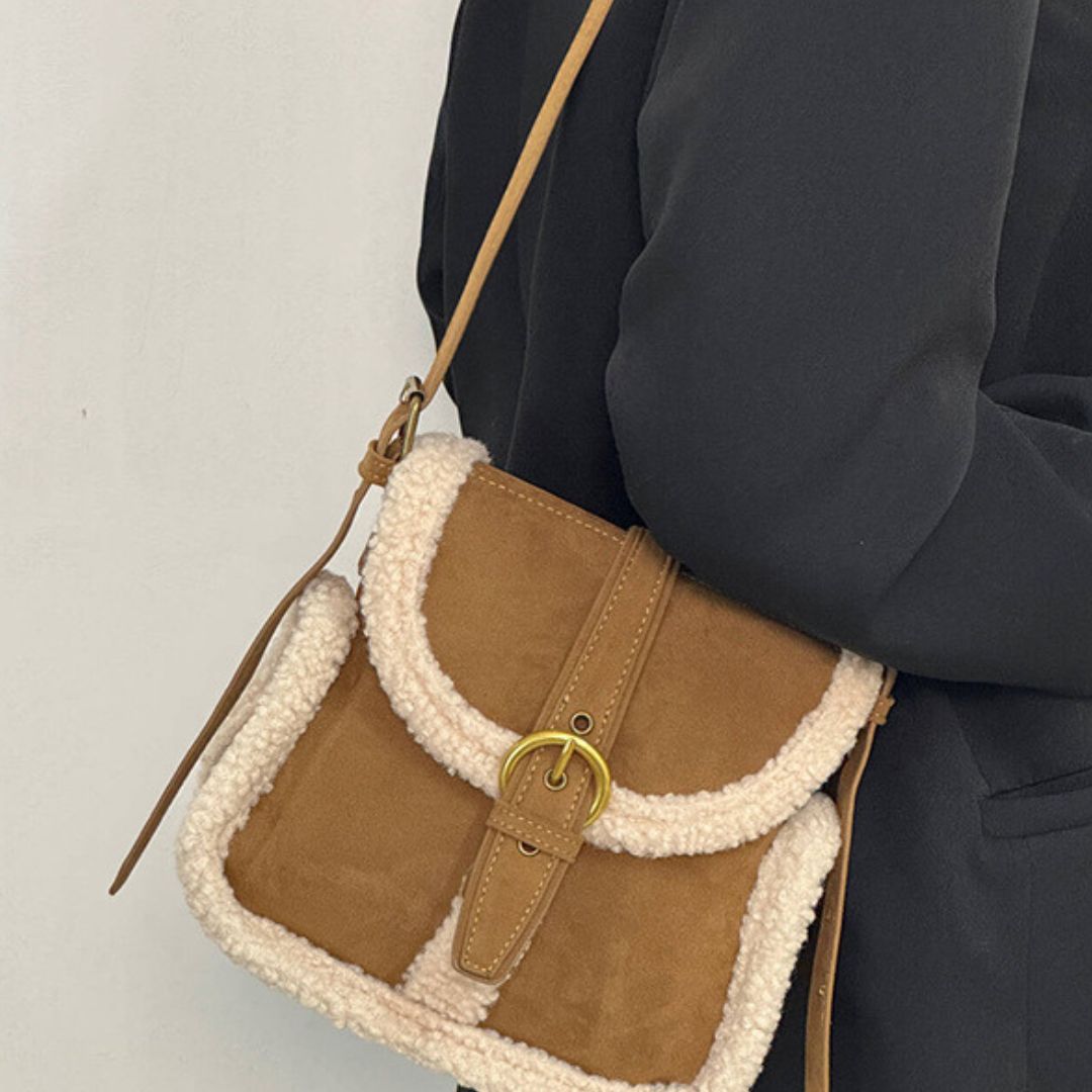 Ich liebe das Design dieser Tasche. Die Kombination aus Lammwolle und dem Schnallenverschluss macht sie besonders.